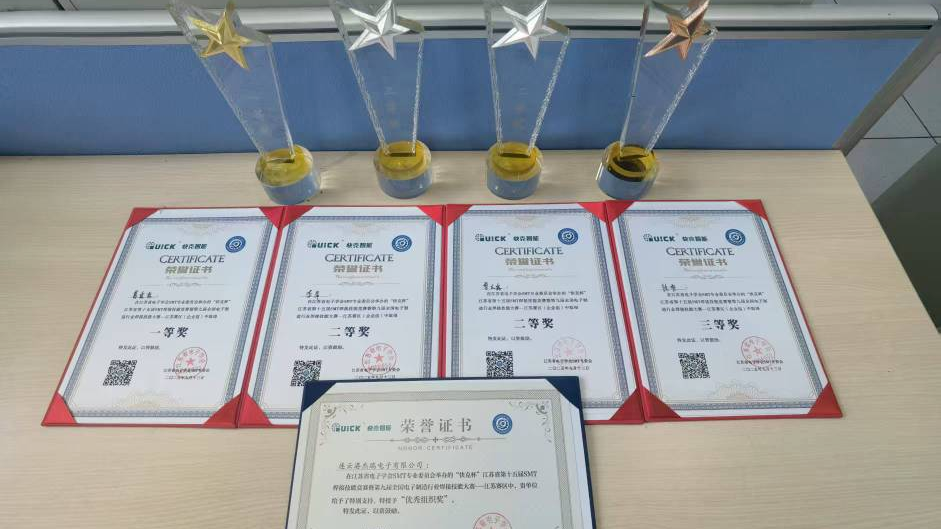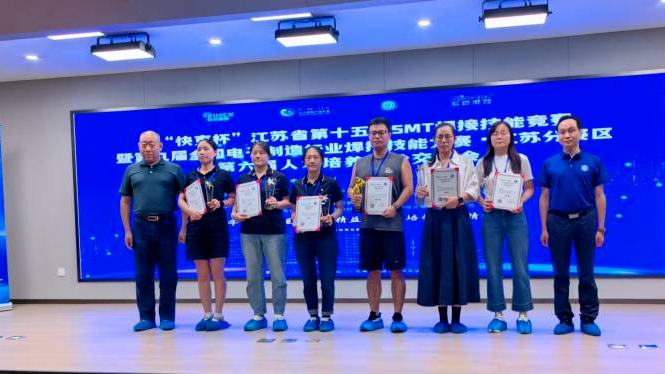 近日,由江苏省电子学会SMT专业委员会主办的“快克杯”江苏省第十五届SMT焊接技能竞赛暨第九届全国焊接能手选拔赛顺利落幕,中国船舶集团旗下万搏官方网页版(下称“杰瑞电子”)选派4人参赛并全部获奖。其中,葛露露荣获一等奖,李萍、曾庆露荣获二等奖,徐梦荣获三等奖,杰瑞电子喜获“优秀组织奖”。