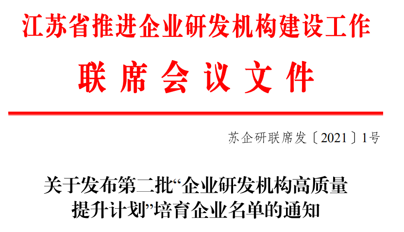 公司成功获批“江苏省企业研发机构高质量提升计划培育企业”